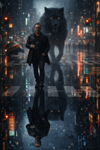 Ultrarealistisches dramatisches Schwarz-Weiß-Porträt des Mannes auf dem Bild, intensive filmische Beleuchtung, tiefe Schatten und scharfe Highlights, teilweise verdecktes Gesicht durch nasses, unordentliches Haar, Regentropfen auf Gesicht und Bart, Hautstruktur, hochdetaillierte, emotionale und dunkle Stimmung, Kapuzenjacke, launische Atmosphäre, dunkler minimaler Hintergrund, hoher Kontrast, 8K-Fotografie, filmisches Porträt, geringe Schärfentiefe, Schattenwesen auf beiden Seiten im Hintergrund und durch einen Blitz erhellt mit Regen
